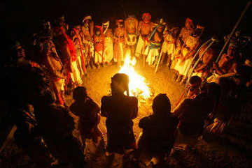 Un grupo de danzantes toma calor de una fogata en el atrio de la iglesia de la localidad, luego de bailar todo el jueves y la madrugada del viernes |